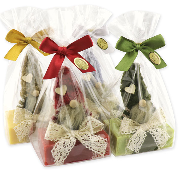 Schafmilchseife eckig 150g dekoriert mit Wichtel in Cello, sortiert