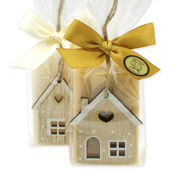 Schafmilchseife eckig 100g dekoriert mit Haus in Cello, Classic/Zirbe