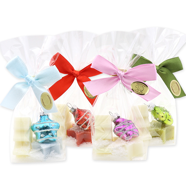Schafmilchseife Baum 16g und Stern 12g dekoriert mit Glasstern in Cello, sortiert