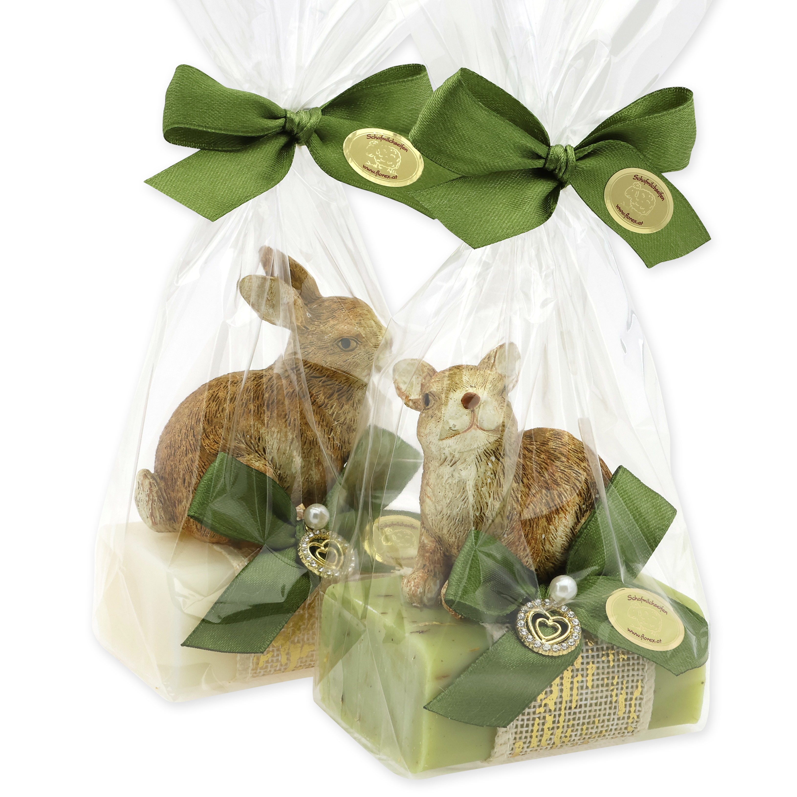 Schafmilchseife eckig 100g dekoriert mit Hase in Cello, Classic/Eisenkraut