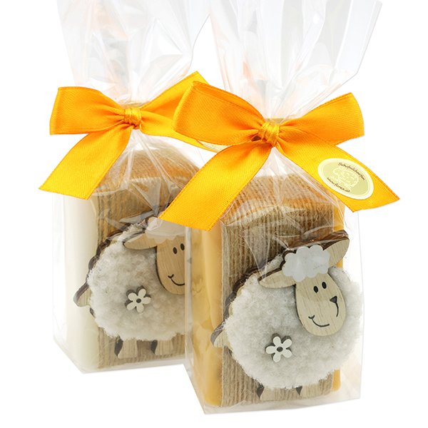 Schafmilchseife eckig 100g dekoriert mit Schaf in Cello, Classic/Ringelblume