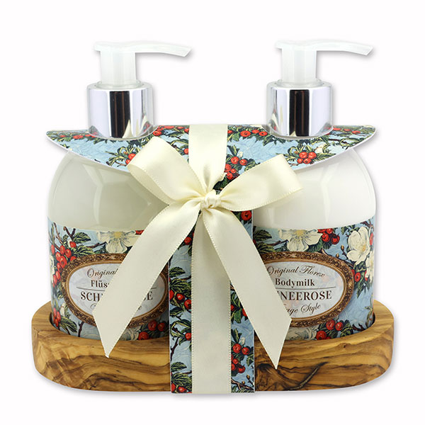 Body milk 250ml and liquid soap 250ml on a wooden shelf "Vintage motif 209", Christmas rose white