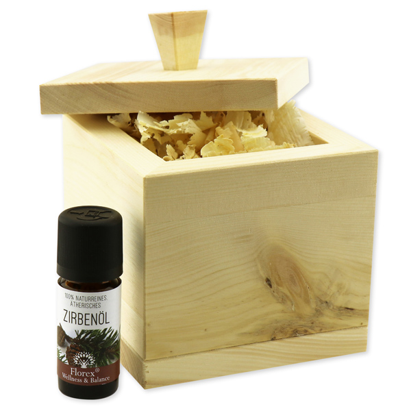 Swiss pine oil 10ml and swiss pine shavings in a swiss pine box, in a cellophane