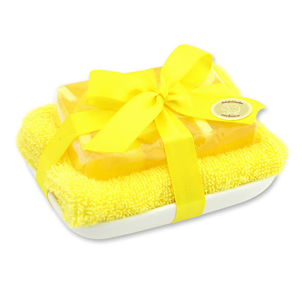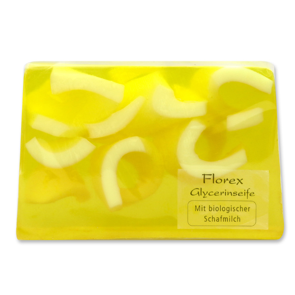 Handmade glycerin soap 90g in cello on a soap dish, Lemon