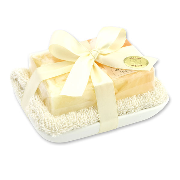Handgemachte Glycerinseife 90g in Folie auf Seifenschale, Rosentraum