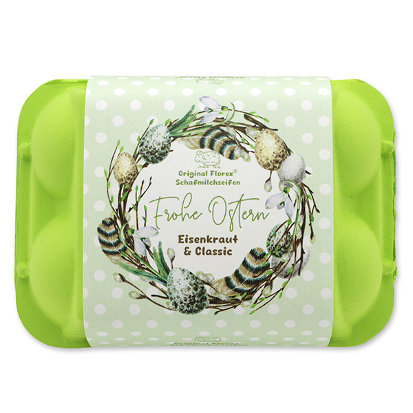 Schafmilchseifen Ostereier 61g "Frohe Ostern" im Eierkarton, Classic/Eisenkraut