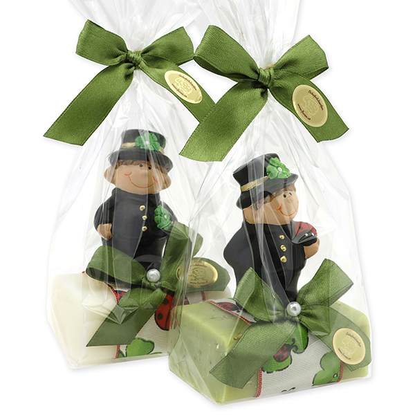 Schafmilchseife eckig 100g dekoriert mit Rauchfangkehrer in Cello, Classic/Eisenkraut