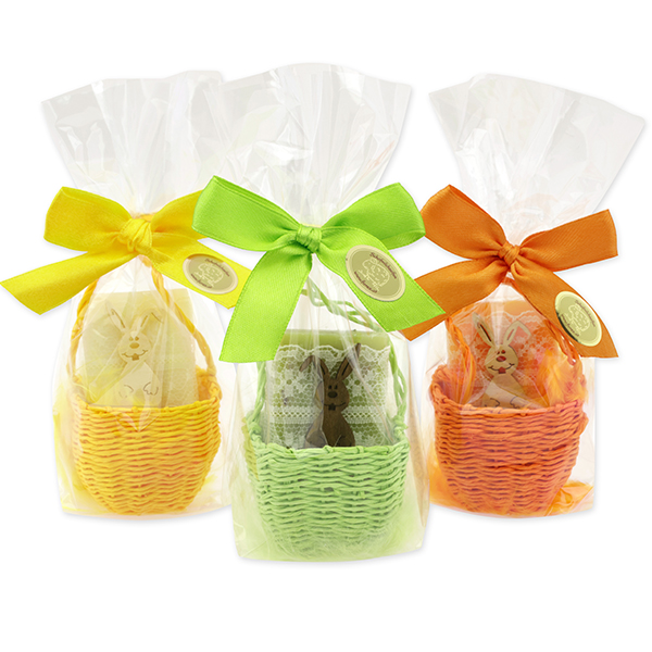 Körbchen gefüllt mit Schafmilchseife Quadrat 35g dekoriert mit Hase in Cello, Sortiert