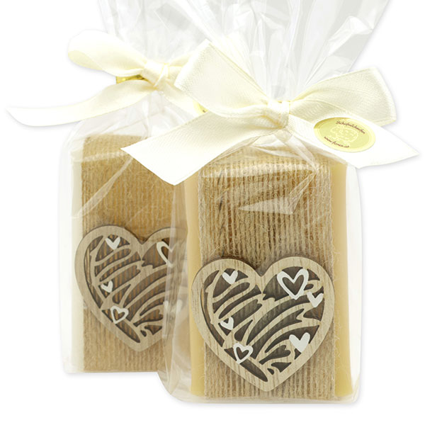 Schafmilchseife eckig 100g dekoriert mit Herz in Cello, Classic/Zirbe