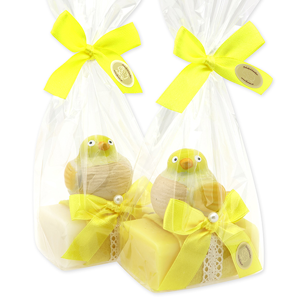 Schafmilchseife eckig 100g dekoriert mit Vogel in Cello, Classic/Grapefruit