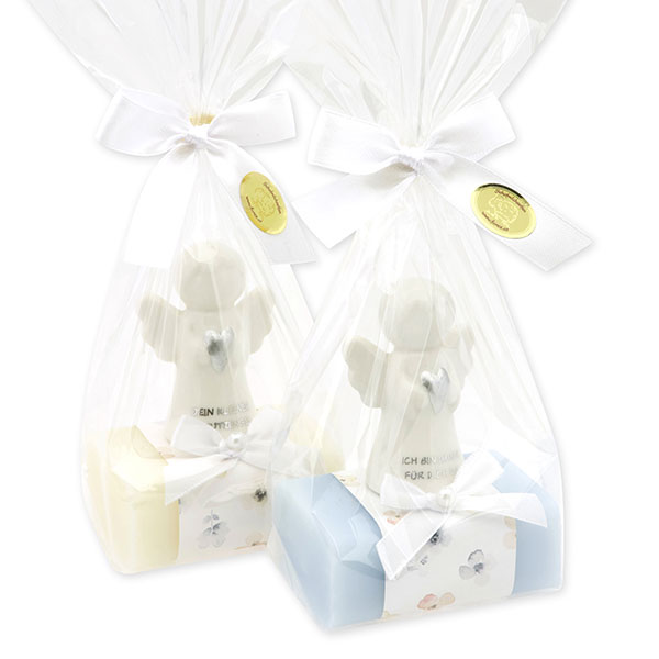 Schafmilchseife eckig 100g dekoriert mit Schutzengel mit Herz in Cello, Classic/Vergissmeinnicht