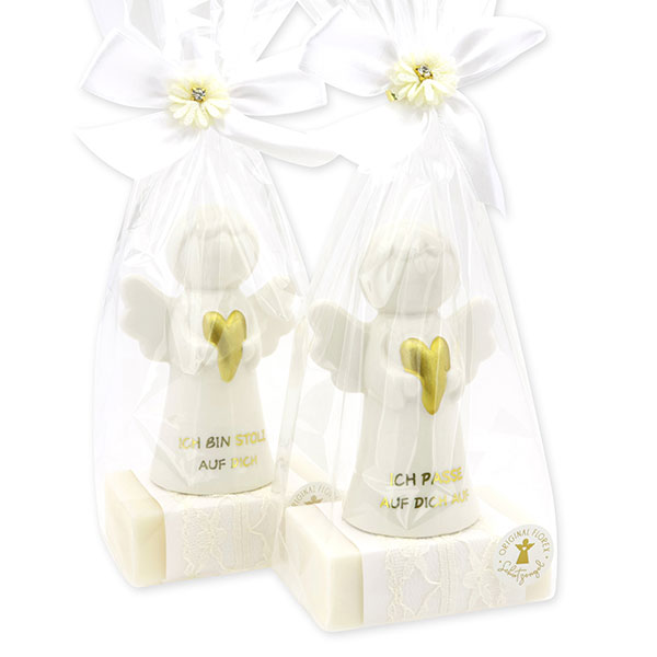 Schafmilchseife eckig 150g dekoriert mit Schutzengel mit Herz in Cello, Classic/Schneerose
