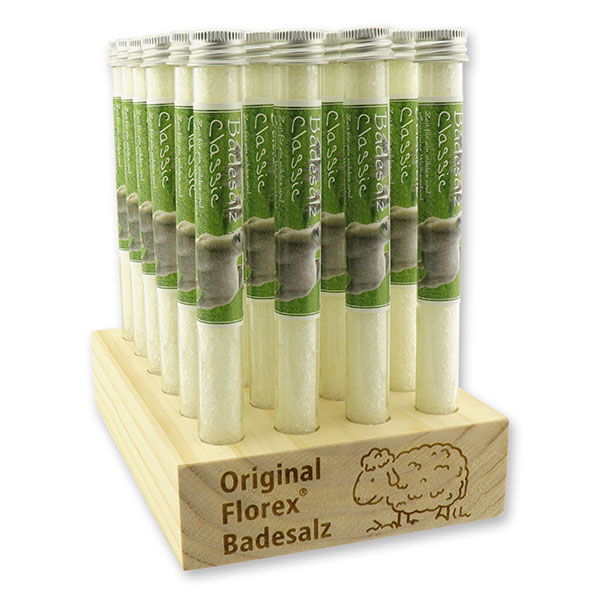 Aufsteller Holz befüllt mit Badesalz in der Phiole 28g, Classic