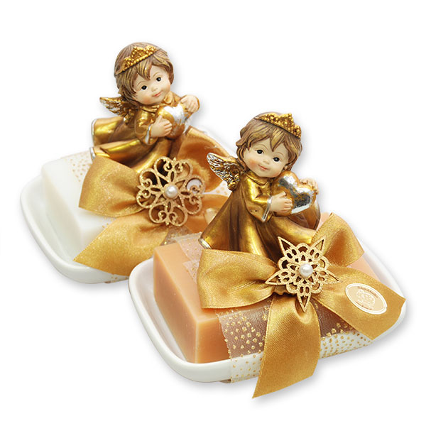 Schafmilchseife eckig 150g auf Seifenschale dekoriert mit Engel, Classic/Quitte