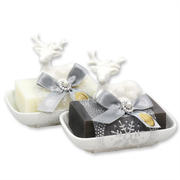 Schafmilchseife eckig 150g auf Seifenschale dekoriert mit Hirsch, Classic/Christrose