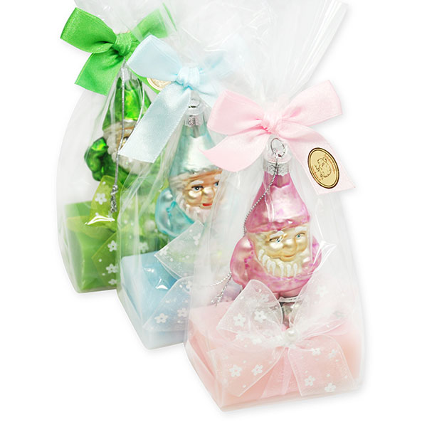 Schafmilchseife eckig 100g, dekoriert mit Gartenzwerg in Cello, sortiert