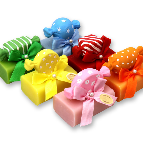 Schafmilchseife eckig 100g dekoriert mit Zuckerl groß bunt, sortiert