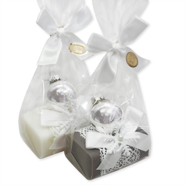 Schafmilchseife eckig 100g dekoriert mit Glaskugel in Cello, Classic/Christrose