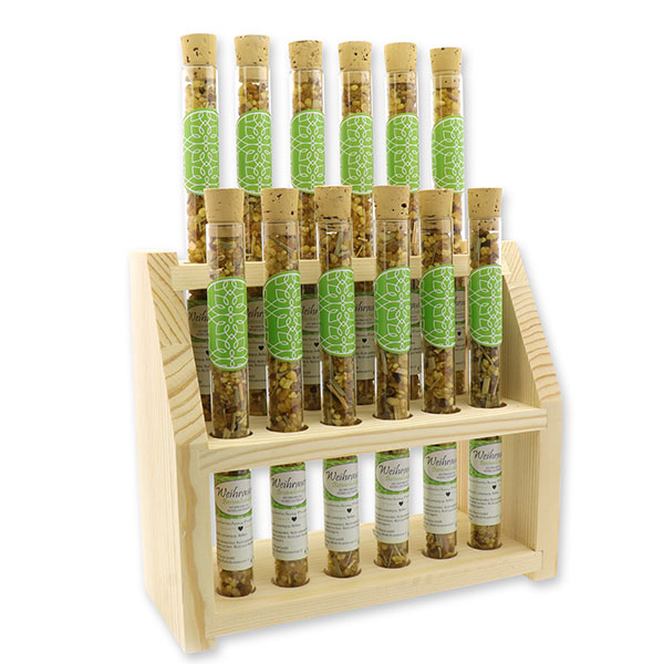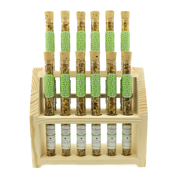 Wooden stand filled with incense mix 18g in a vial, "Besinnlichkeit"