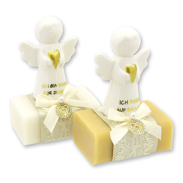 Sheep milk soap square 100g decorated with guardian angel with heart in a cellophane bag, Classic/Swiss pine