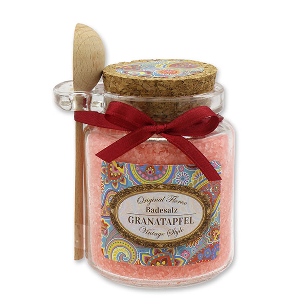 Badesalz 300g im Glas mit Holzlöffel "Vintage-Motiv 36", Granatapfel