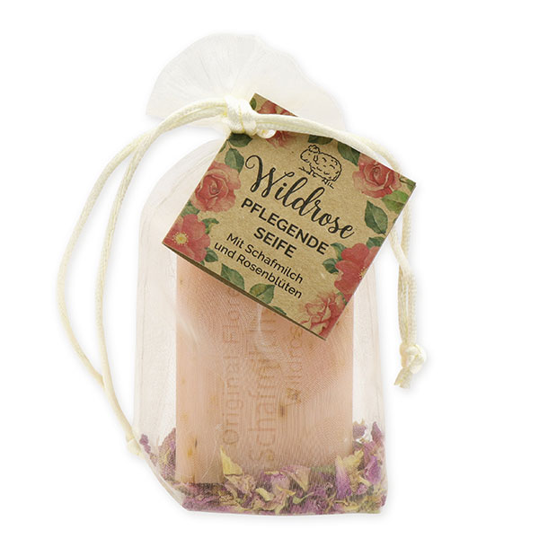 Schafmilchseife eckig 100g mit Rosenblüten im Organzasackerl "Wohlfühlzeit", Wildrose